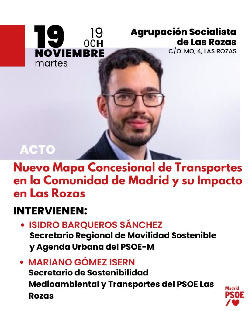 El próximo martes 19 de noviembre nos visitará Isidro Barqueros Sánchez, Secretario Regional de Movilidad Sostenible y Agenda Urbana del PSOE – M, para hablarnos del nuevo mapa concesional de transportes de la Comunidad de Madrid. Nuestro Secretario de Sostenibilidad Medioambiental y Transportes, Mariano Gómez Isern, intervendrá para trasladarnos cómo va a impactar este nuevo […]